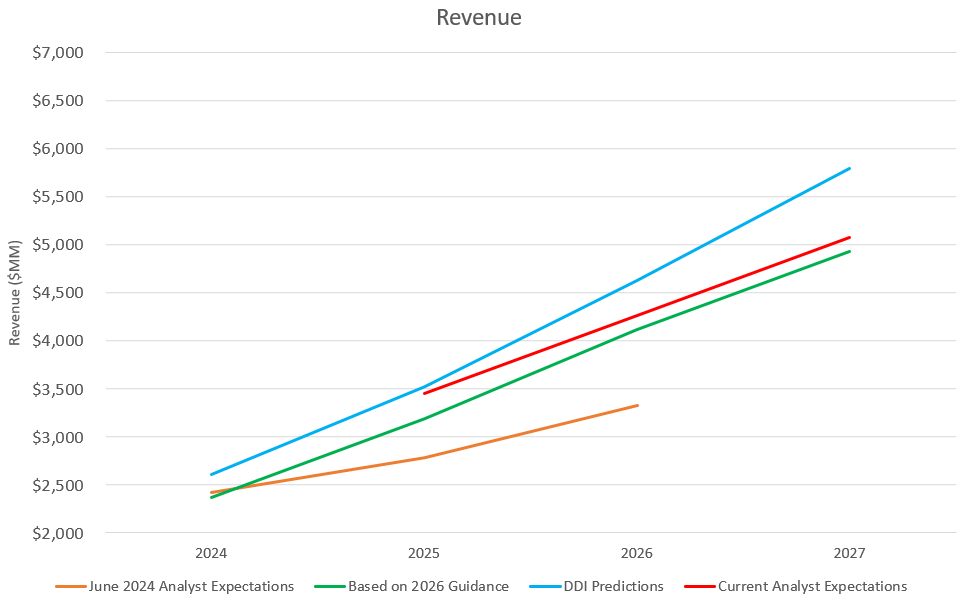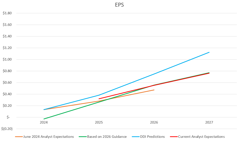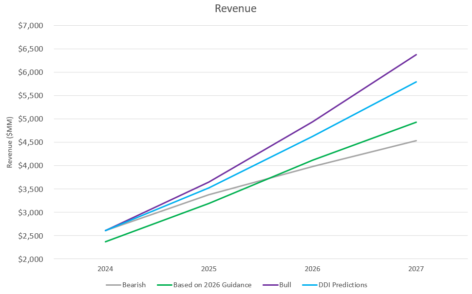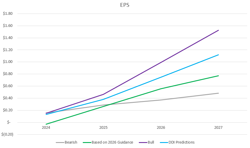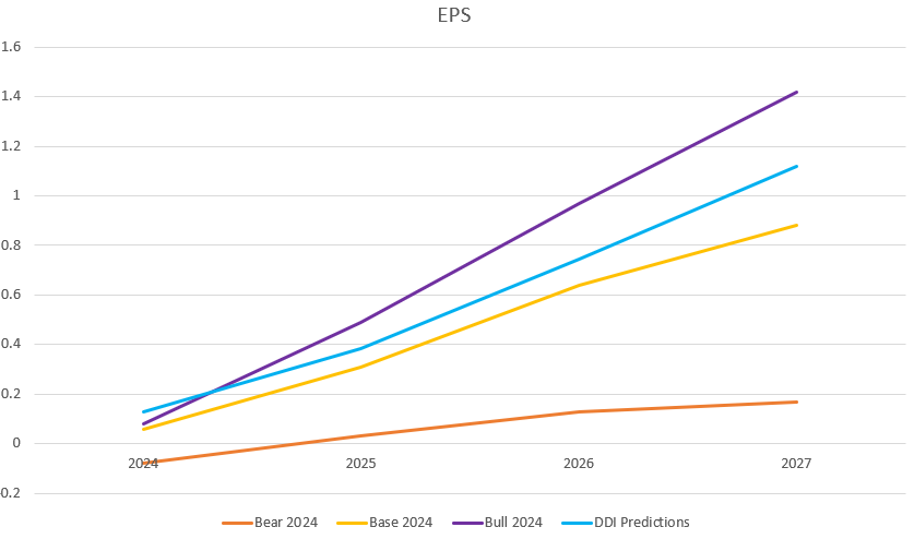 Below you will see the revenue and EPS outcomes for 2024 through 2027 for a bearish case, bullish case, my own projections (labeled DDI). I’ve also included the outcomes from what I originally calculated in June 2024 that they’d achieve based on the guidance they gave at Q4 2023 earnings (the green line), so you can see how ahead of schedule they are, which is also the reason I included 2024. I’m not sharing every growth and margin assumption (I’ll keep that to my paid subscribers), but you can probably get a reasonable approximation from the discussion above.