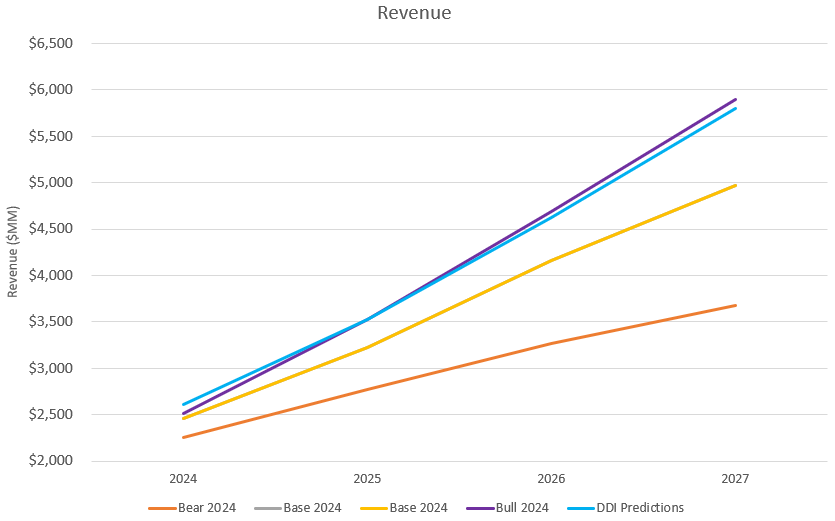 It was interesting to check how SoFi is trending compared to the bearish, base, and bullish predictions I made in 2024. This is instructive to me because it helps me understand where I was right and where I was wrong and how I can improve my own predictions moving forward. It also shows how well SoFi has or has not executed relative to what I thought was possible a year-and-a-half ago. Here are those 2024 revenue scenarios compared with my current DDI prediction.