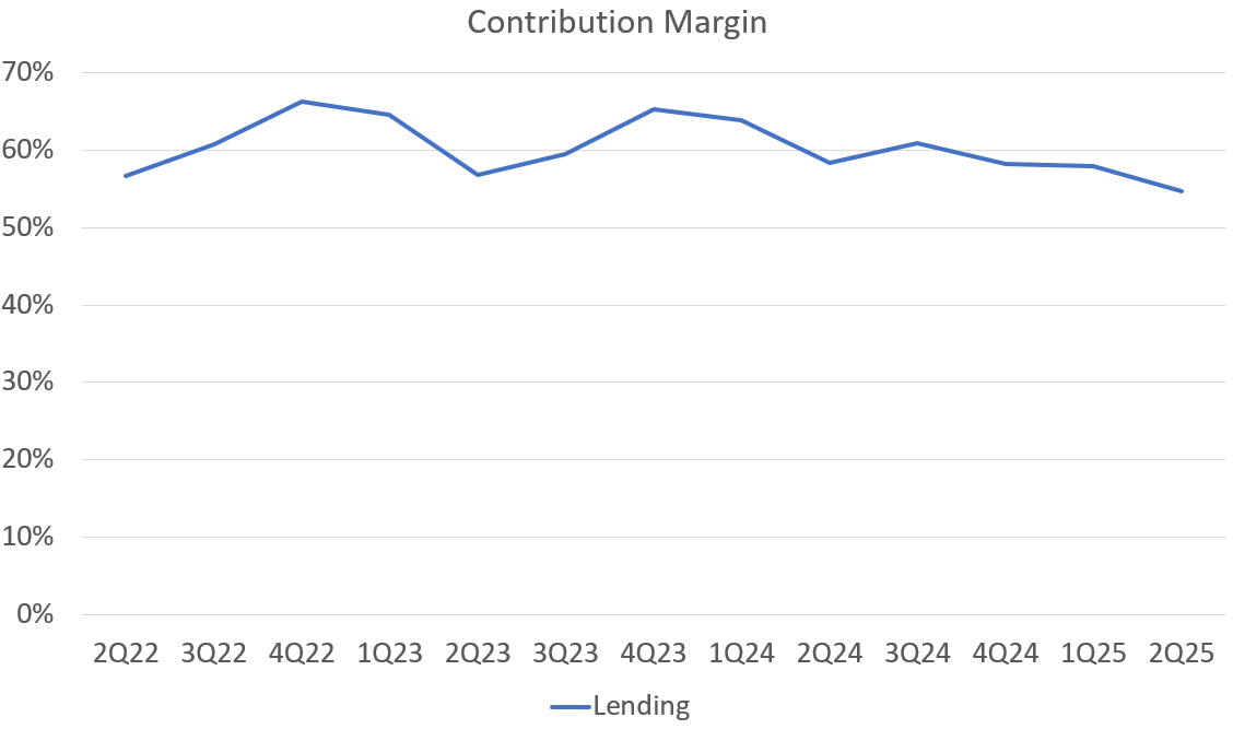 The contribution margin of that revenue is a bit of a different story. My original requirements called for a contribution margin in the low-to-mid 60. Here is what lending contribution margin has looked like for the last several years.