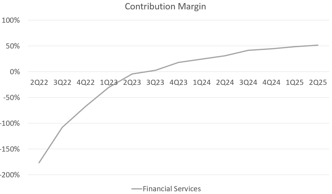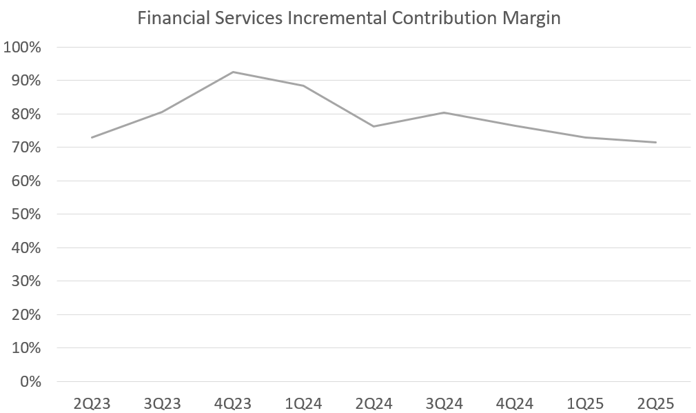 In 2023, when they were really pushing for profitability, incremental margins got as high as 92.4%. That means for each new dollar of financial services revenue growth, 92.4 cents went towards contribution profit. Financial services probably has the most operating leverage of any of their businesses. There are fairly set fixed costs, but the variable cost of each new dollar of revenue is extremely low.If necessary, and if they were only hyperfocused on profitability, they could probably drive 80%+ contribution margins if they wanted to. I don’t expect them to ever get that high because the higher ROI in the long-term is to reinvest a portion of that money to drive future growth. Even with their greater reinvestment into brokerage and credit cards, incremental margins still have yet to dip below 70%.