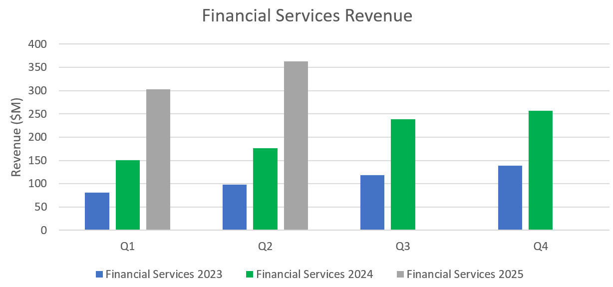 When SoFi originally set its guidance, 80% growth for this segment in 2024 and a 50% 3-year CAGR seemed like quite a stretch. Now that guidance seems significantly sandbagged. 2024 Financial Services revenue growth ended up at 88%. In Q1 and Q2 of this year, the segment put up 101% and 106% growth, respectively, compared to 2024. Q3 and Q4 comps are much harder since they include the LPB now, but even with absolutely no growth whatsoever from Q2 levels, they would still put up 69% growth in 2025. The LPB has truly been a gamechanger. They are so far ahead of that 50% CAGR guide that at this point it’s basically a foregone conclusion that they’ll absolutely torch those expectations.