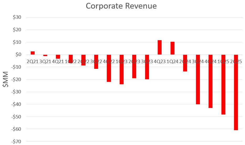 My original projections from June 2024 assumed corporate revenue would be around -$40M per year. A value of -$60M/qtr adds a significant wrench into the projections that was not accounted for properly in the past. The extremely frustrating thing is that I have absolutely no idea how to project this value going forward. What changed from Q3 2023 to Q4 2023 when it went from -$20M to +12M? Why did it fall so far in the last year? Will this revert back to -$40M or by next year at this time will it be at -$80M or -$100M? I know this company about as well as any non-employee, yet I have no answers to those questions. I wish there were more clarity here and I wish that there were some way to predict it.