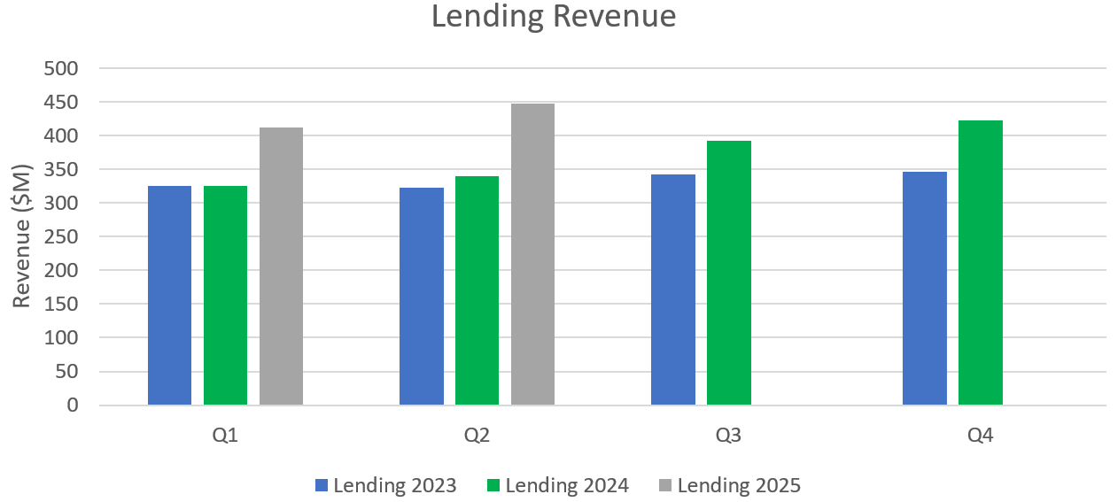 The first half of 2025 has been absolutely stellar for lending growth. Growth was 27% in Q1 and then 32% in Q2. Those were both fairly easy comps from a year ago, but they are now so far ahead of their original guidance that even if lending were flat at Q2 levels in Q3 and Q4, they’d still come out $150M above what their original guidance implied they’d need to get to in 2025.