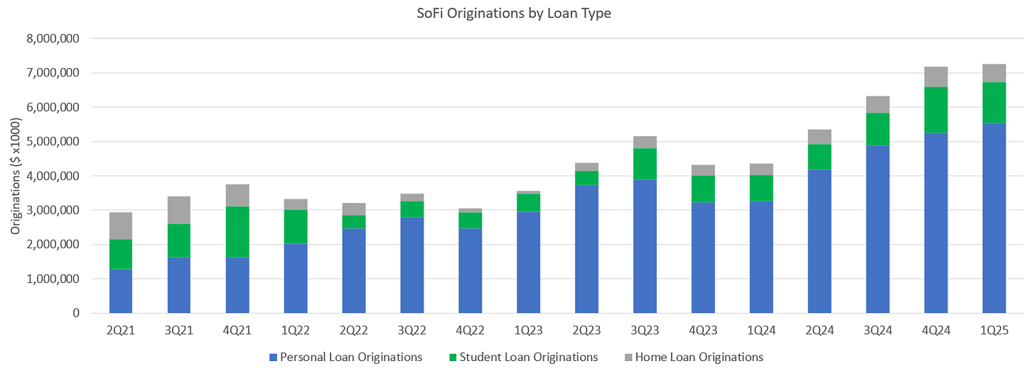 The apple of every SoFi investor’s eye right now is the LPB. Last quarter’s jump in both originations and take rate was amazing. Revenue per member hit a new all-time high as a result. We know there will be at least some modest growth in LPB originations to $1.75B+. If they can start to expand outside their credit box for personal loans, or include student loans or home loans in the LPB, we could see some more fireworks here.
