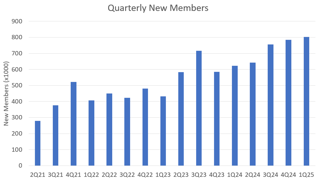 New Members: 835k (815k net new members with 20k churning off the platform)
