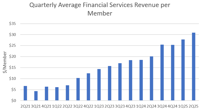 Combine this growth with the exponential member growth and the results have been wild. Last quarter they made $30.86/member in financial services revenue. They are ramping Invest and credit cards, and obviously the LPB continues to expand every quarter. I’m assuming $32.50/member this quarter, which I think is a reasonable ramp. It will definitely be low if the LPB scales into new loans, but I think it’s a good estimate. That leaves us with $414M in FS revenue for this quarter