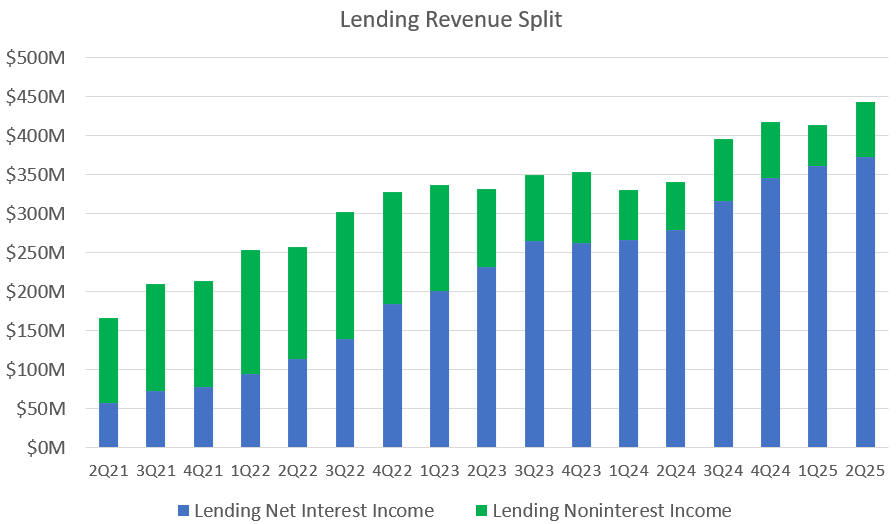 Net Interest Income only goes one way for SoFi. Noninterest Income is fairly lumpy, but with a good origination quarter and rates coming down, it should be strong. I have lending revenue increasing to $485M in Q3 on the continued expansion of the balance sheet and strong origination growth. Noninterest income should be bolstered by the strong home loan and student loan quarter as well.