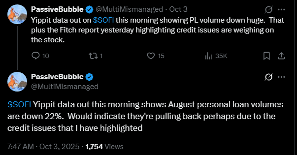 Unsurprisingly, this bear cherry-picked the only bearish part of very bullish data. The data do show that August M/M numbers were down 22% from July. However, what they failed to mention is that that was still 41% Y/Y growth and in July and August combined, there was 59% Y/Y growth compared to July and August of 2024. If that 59% Y/Y trend continued for all of Q3, it would imply $7.78B in PL originations and 11.6% Q/Q growth.