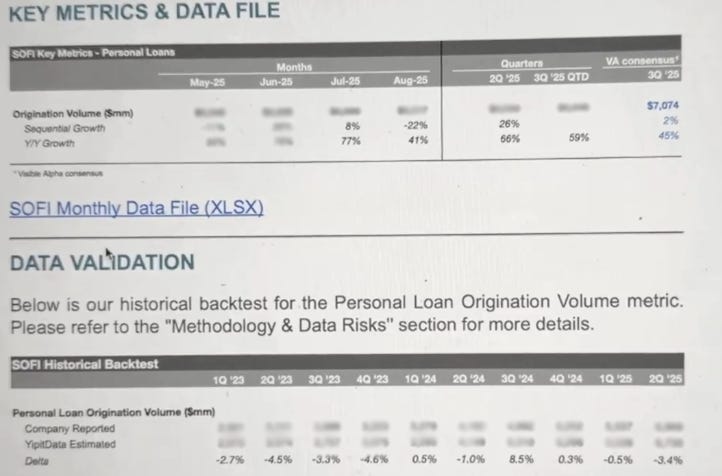 The point of highlighting a one-month drop of 22% was to stoke fears of a slowdown in business. The overall data show quite the opposite. The data does not show September so I’m just extrapolating to get the $7.78B number, so take that with a grain of salt. As an aside, YipitData’s historical back test accuracy actually looks quite good. Their data seem very credible. That’s great since it’s so bullish. However, the overall signal is looking very nice. Because August was a bit of a down month for originations, it seems probable that September also may not be as high as July’s numbers. I think SoFi will originate around $7.6B in PL originations.