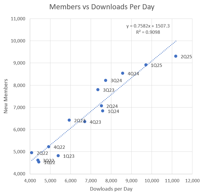 The last piece of data we have is the recent SensorTower data that also came from Tannor at Future Investing. This is the total app downloads across both Android and iOS, and it actually maps pretty well to new members. Here is new members per day compared to downloads per day for all the data that Tannor showed in his video. I don’t have access to the raw data, so I just transcribed what he had on screen. The trendline is also shown below. The R-squared value is 0.91, which essentially means that 91% of the change in the value of new members can be predicted by the change in new downloads. That’s an exceptional correlation.