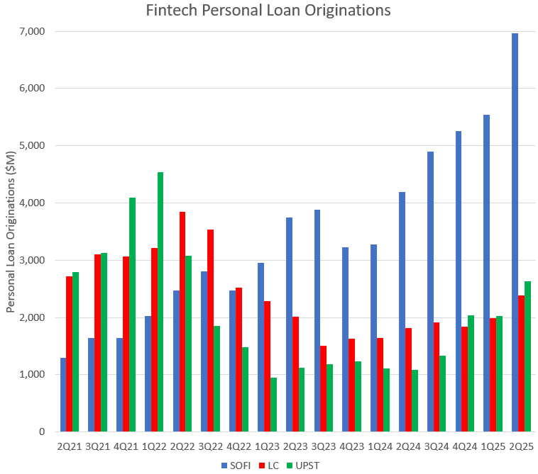 I thought that SoFi would have $5.8B in personal loan originations. They absolutely demolished my estimates and came in with a whopping $6.97B. They beat my estimate, which I considered fairly bullish, by almost $1.2B. Let’s look at their originations compared to other fintech lenders LendingClub and Upstart.
