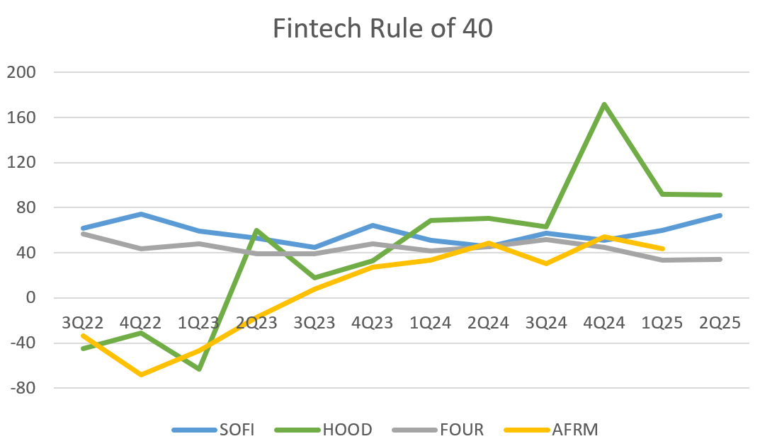 Only Robinhood has managed to post a single quarter better than SoFi’s Q2 print. And Robinhood had an extremely rough 2022 and 2023, where they posted a rule of 40 score of -63 at the low in Q1 2023. It is easier to post growth after a period of contraction, which SoFi has never had. HOOD has had some monster quarters recently, but for sheer consistency, nothing beats SoFi’s performance. FOUR is the next closest, but has been under SoFi every quarter except Q2 2024, where they came in at 45.4 to SoFi’s 45.2. To my knowledge, no other US fintech that has had an IPO in the past 5 years has posted a Rule of 40 score above 40 every quarter since the beginning of 2022 except SoFi. That is incredible consistency and execution in any industry, but especially one that is supposedly rate-sensitive during a rate hike cycle. SoFi’s management still does not get enough credit for what they’ve accomplished.