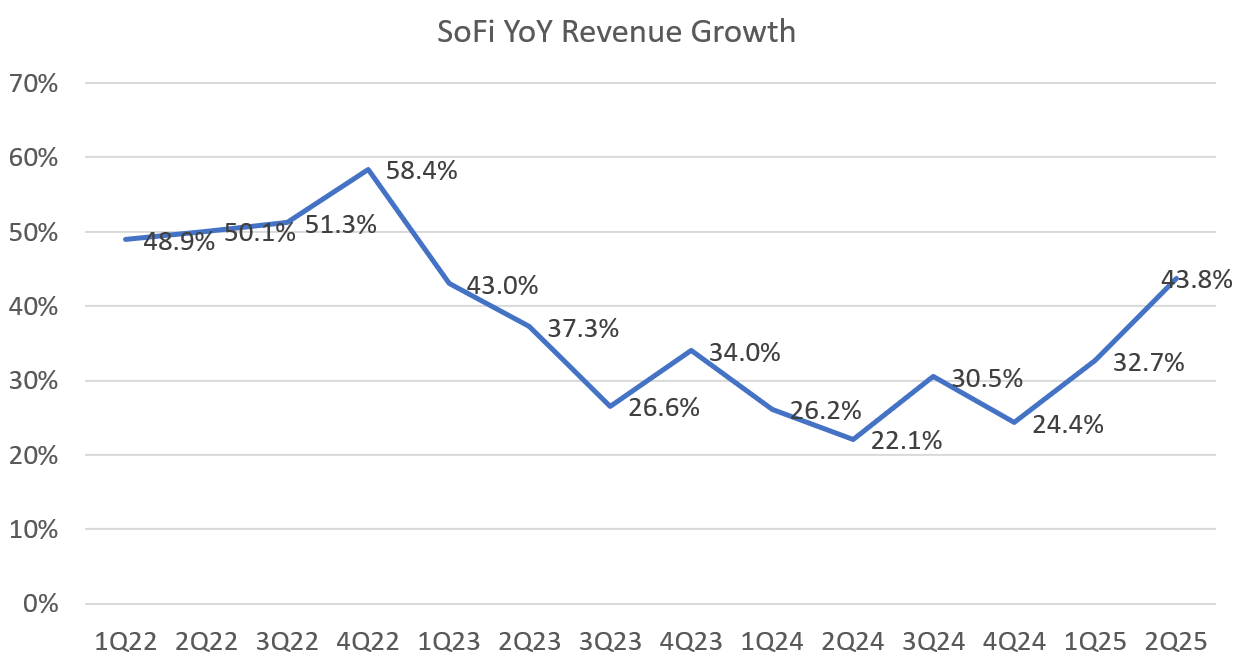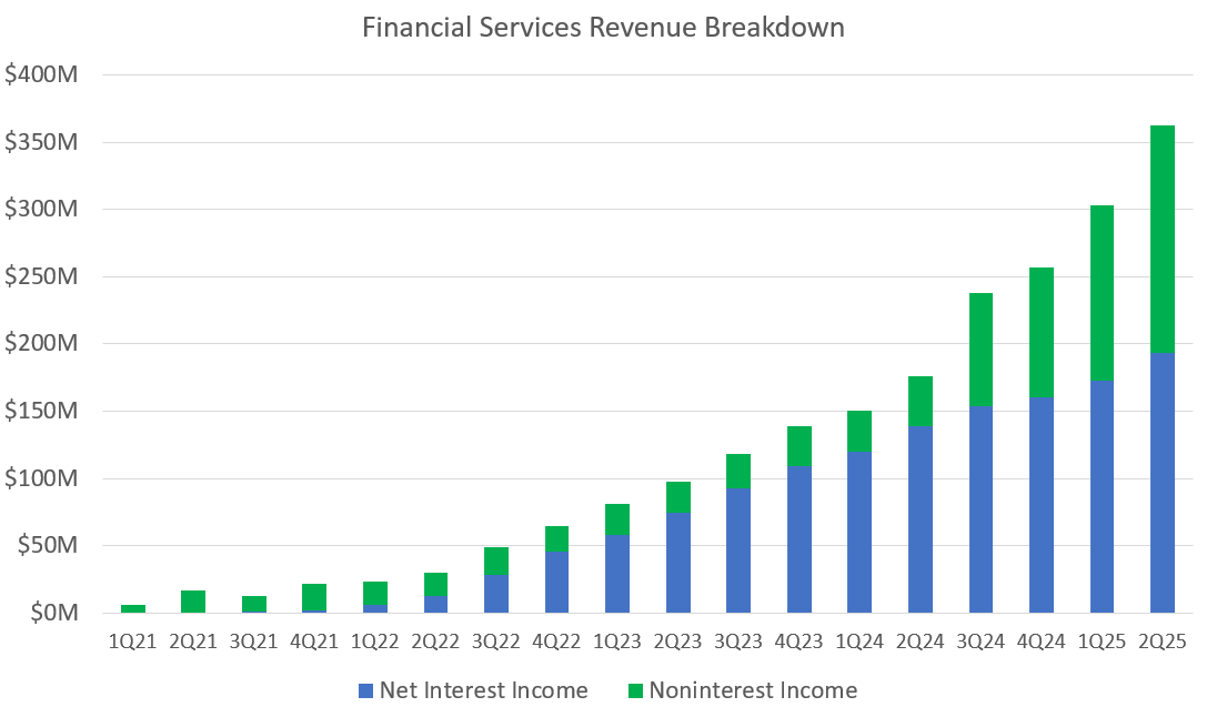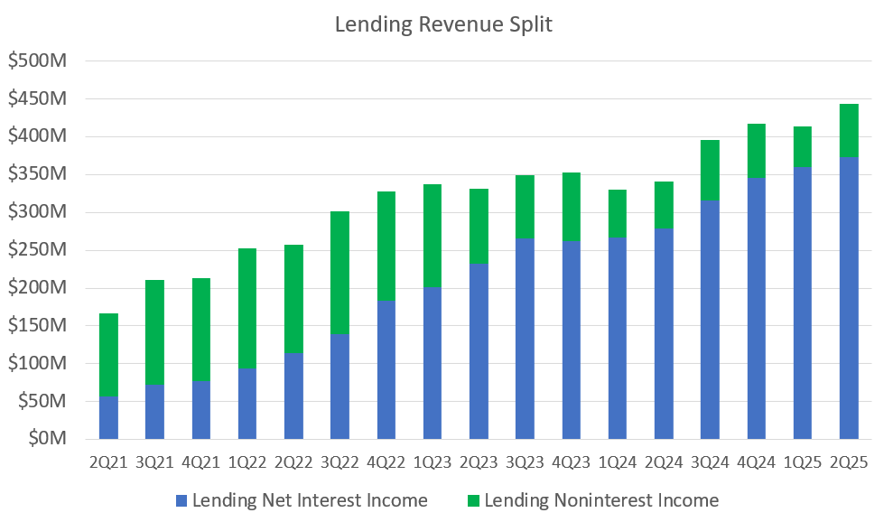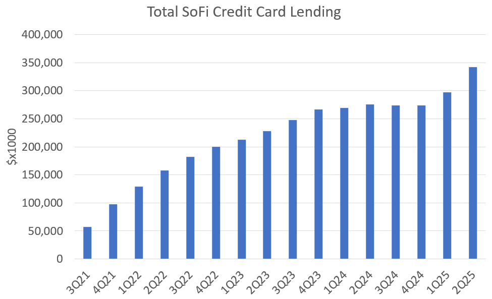 Charge-offs peaked at a whopping 19.3% in Q1 of 2023 but have now come all the way down to 7.7%. Credit cards could easily be another billion dollar business, but they had to deal with these massive losses and get the underwriting correct first. It looks like they’ve done that and I expect that credit cards will be one of the sleeper best-growing portions of SoFi’s business in 2026. If you look at average credit card lending, you can see that it was basically flat for five straight quarters from Q4 2023 through Q4 2024 at around $270M. In Q1, it finally saw a little growth to $297M and then in Q2 it really accelerated to $342M. The ramp in growth is obvious, and the additional capital they just raised should allow them the flexibility they need to accelerate that ramp. I also think we’ll see some creative credit card products tied to secured credit and crypto in the next year or two from SoFi. This is one of their next growth S-curves in the making if they can keep defaults down as they lean back in.