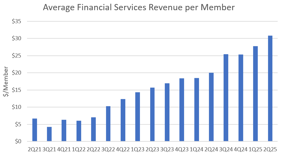 From -107.5% contribution margin in Q3 2022 to 52% in Q2 of 2025 and way higher than the very top end of their long-term contribution margin guide from two years ago. Wow. Look at the return to growth in average Financial Services revenue per member. Where are the bears worrying about how SoFi is just pumping their member numbers with people who are checking their FICO scores and isn’t monetizing their members? In hibernation, that’s where.