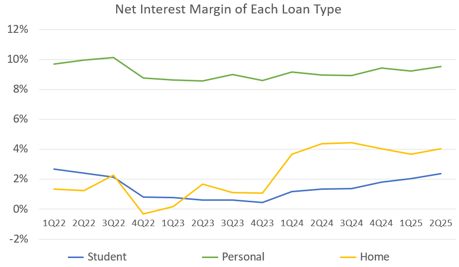 During times of stress, it will be nice to have a ton of high-performing and very low-risk student loans on the balance sheet. They aren’t going to see the type of potential spikes in defaults that personal loans do. However, wouldn’t home loans accomplish the same goal, but with higher net interest income?