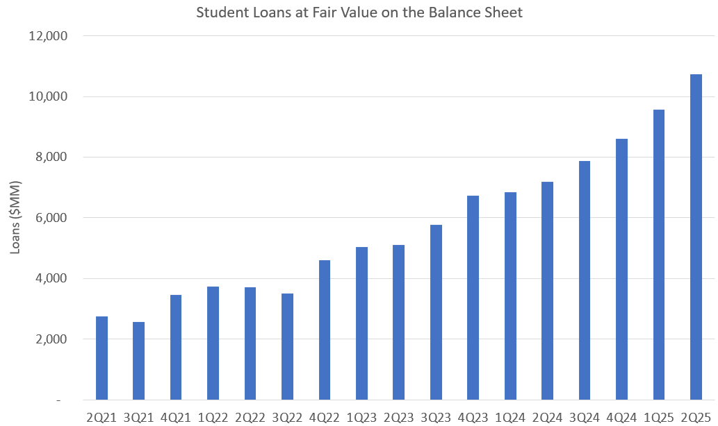 SoFi purchased another batch of older student loans at the end of Q1. They had a higher charge-off rate, so the student loan charge-off rate went up. They probably got a good deal on them, so I have no problem with that purchase. However, it has now been five straight quarters with no student loan sales at all. Student loans also have longer terms, so they don't pay down as quickly as personal loans. As a result, they are building up student loans on the balance sheet at almost the same rate as personal loans. Between Q3 2023 and Q2 2025, they added about $5B in student loans to the balance sheet and $5.4B in personal loans.