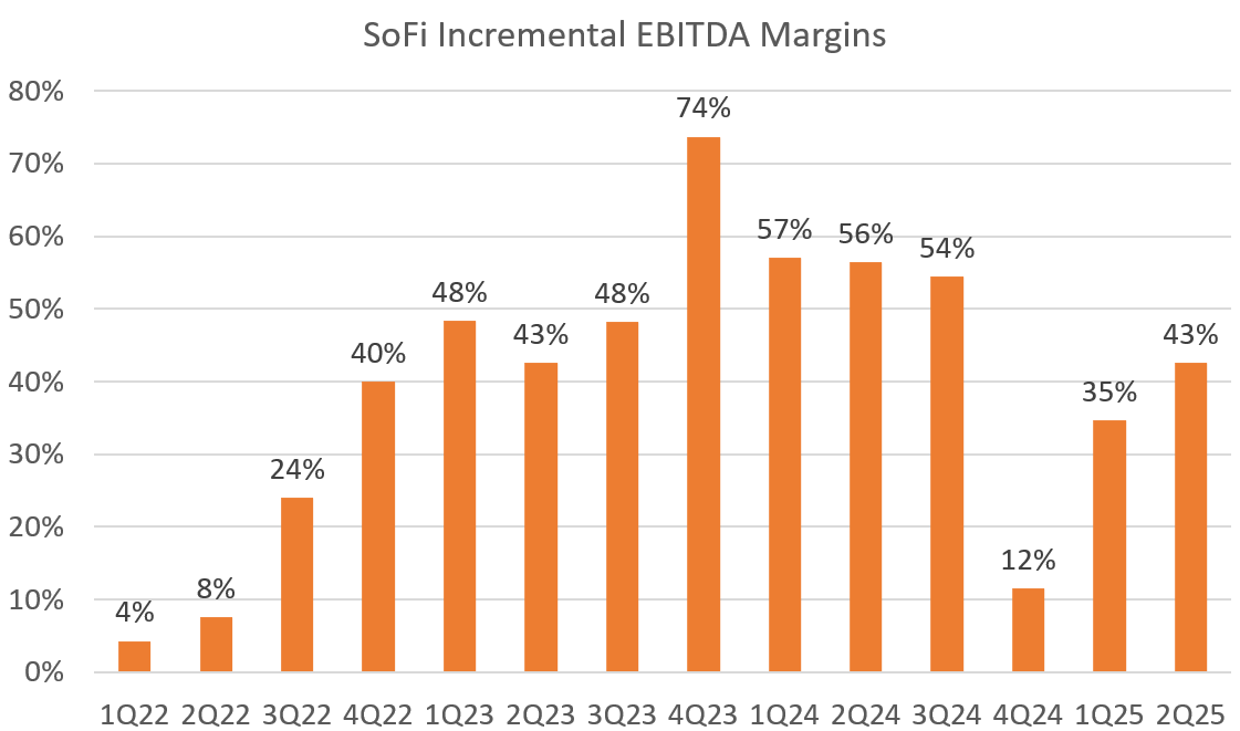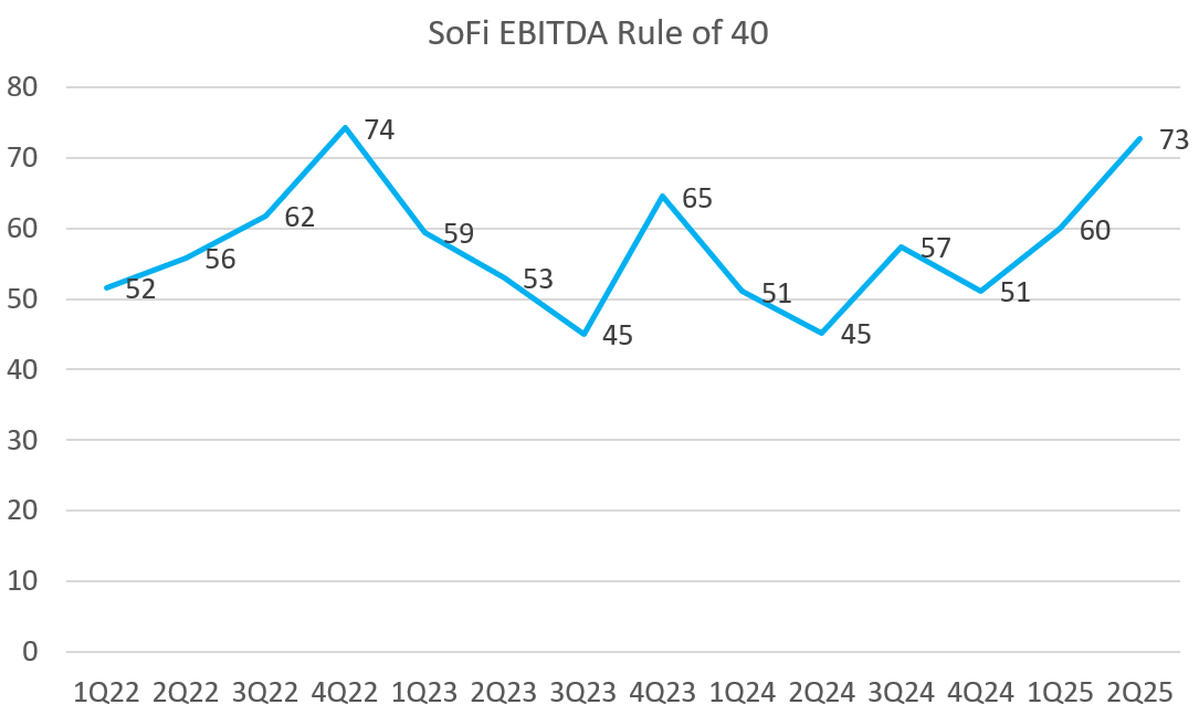 SoFi posted record growth and still managed to drop over 40 cents of every new dollar earned to the EBITDA line. I think the 30% long-term EBITDA margins they have guided for are actually a floor, and based on the actual results, long-term EBITDA margins will be much closer to 40%+ once they are fully optimized. That combination of growth and margins puts them in truly elite company, and the Rule of 40 proves it.