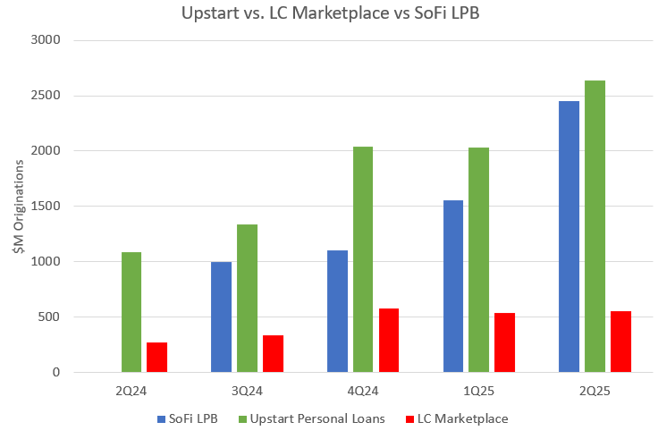 Let’s put this into context for just a second. The vast majority of Upstart’s entire business does the exact same thing as SoFi’s LPB. Upstart was founded in 2012. They’ve been building this business for over a decade. SoFi has been at it one year. Here is SoFi’s LPB origination volume compared with Upstart’s total personal loan origination volume over the last five quarters (I’ve also included LendingClub’s Marketplace, which is a similar product for them, for reference).
